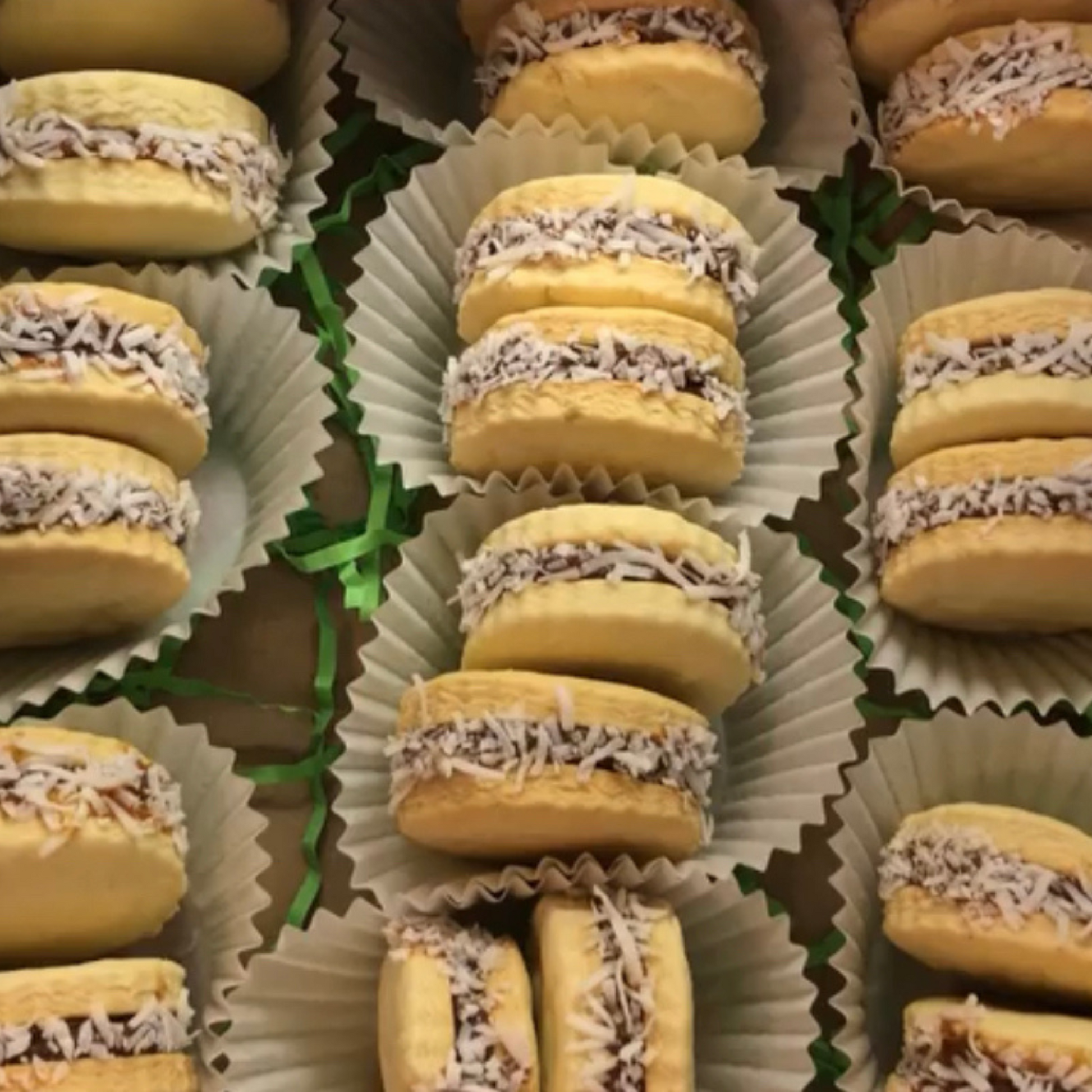 Soft, melt-in-your-mouth cookies filled with a rich dulce de leche and rolled in shredded coconut.